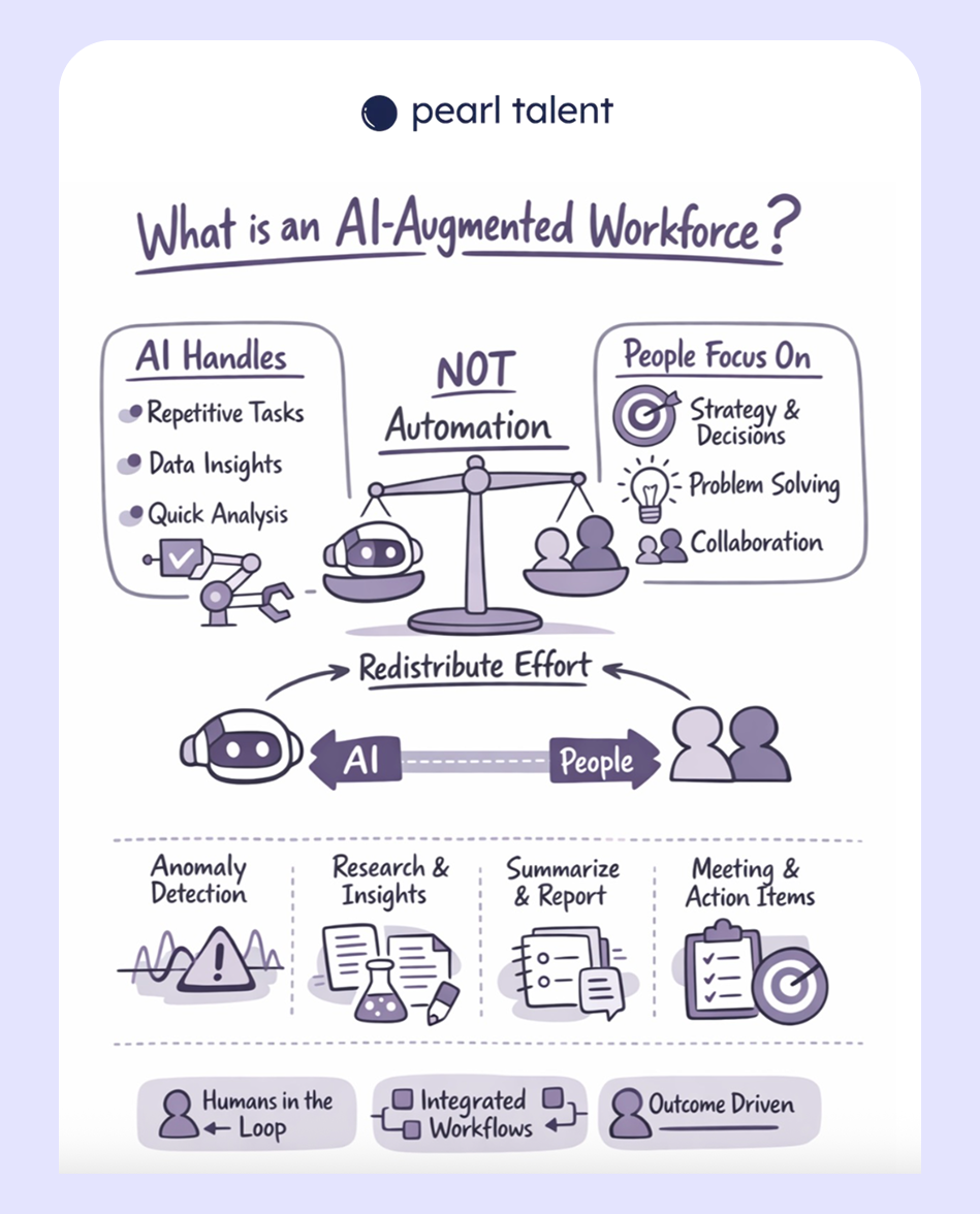 An AI-augmented workforce is the solution to that problem. It redesigns roles, workflows, and decision-making so AI supports human judgment instead of creating noise.