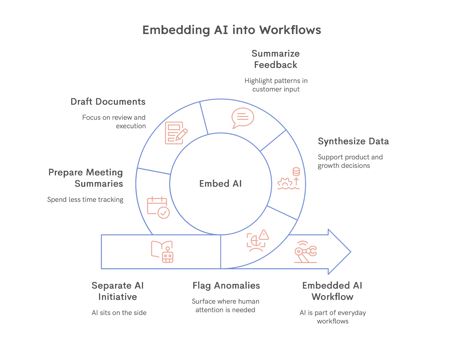 Teams that take this approach avoid the trap of underutilized tools. AI becomes part of how work moves forward rather than something people optionally experiment with. Over time, roles naturally evolve, but accountability stays intact because outcomes (and not activities) anchor ownership.