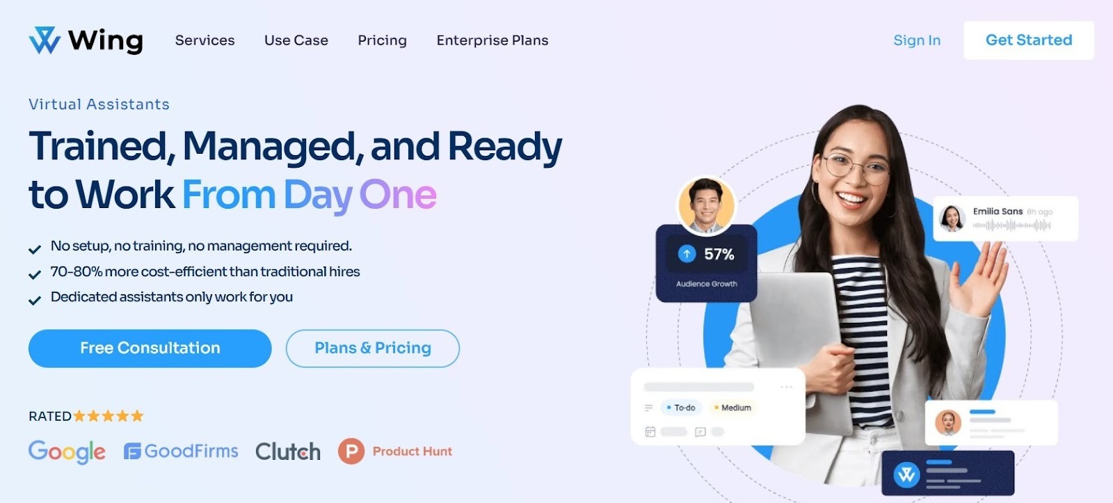 Wing onboards, trains, and supervises their VAs. Each VA you hire has a talent manager and a team they can rely on for help. Although the VA will work your business hours, Wing also offers customized 24*7 support if needed.