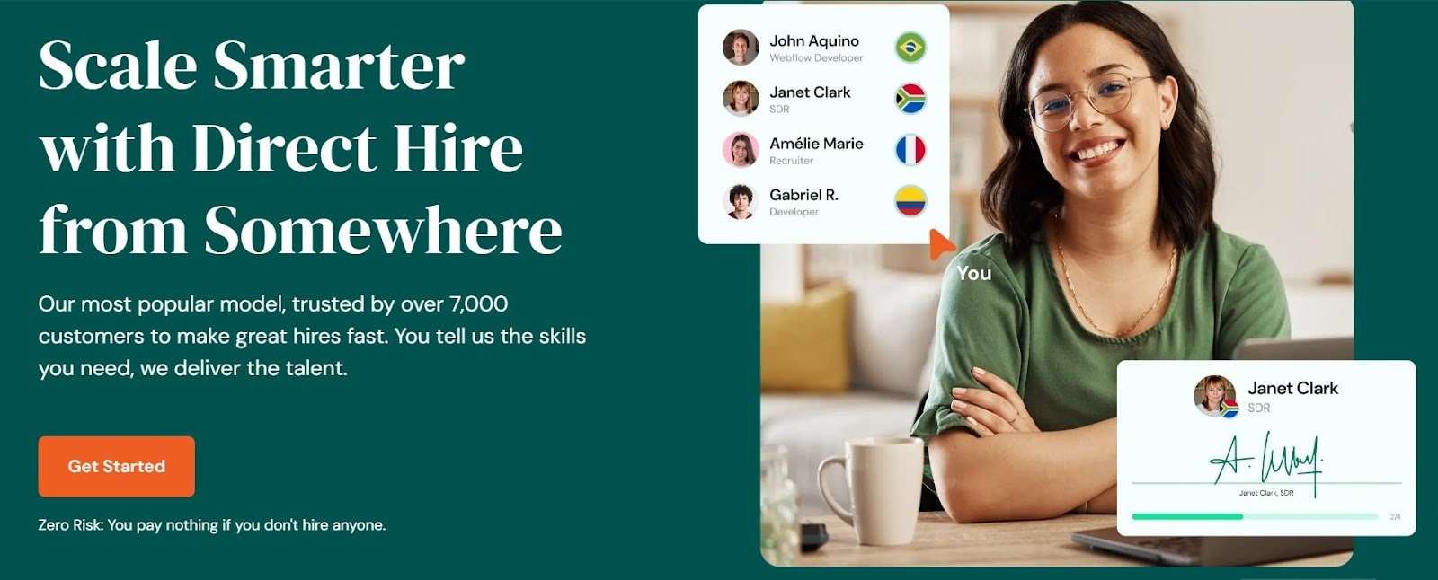 Once you kick things off with Somewhere, the platform sends you pre-vetted candidates to interview till you find the right match. You get ongoing support for short-term hires, but you’ll have to handle everything for permanent hires.