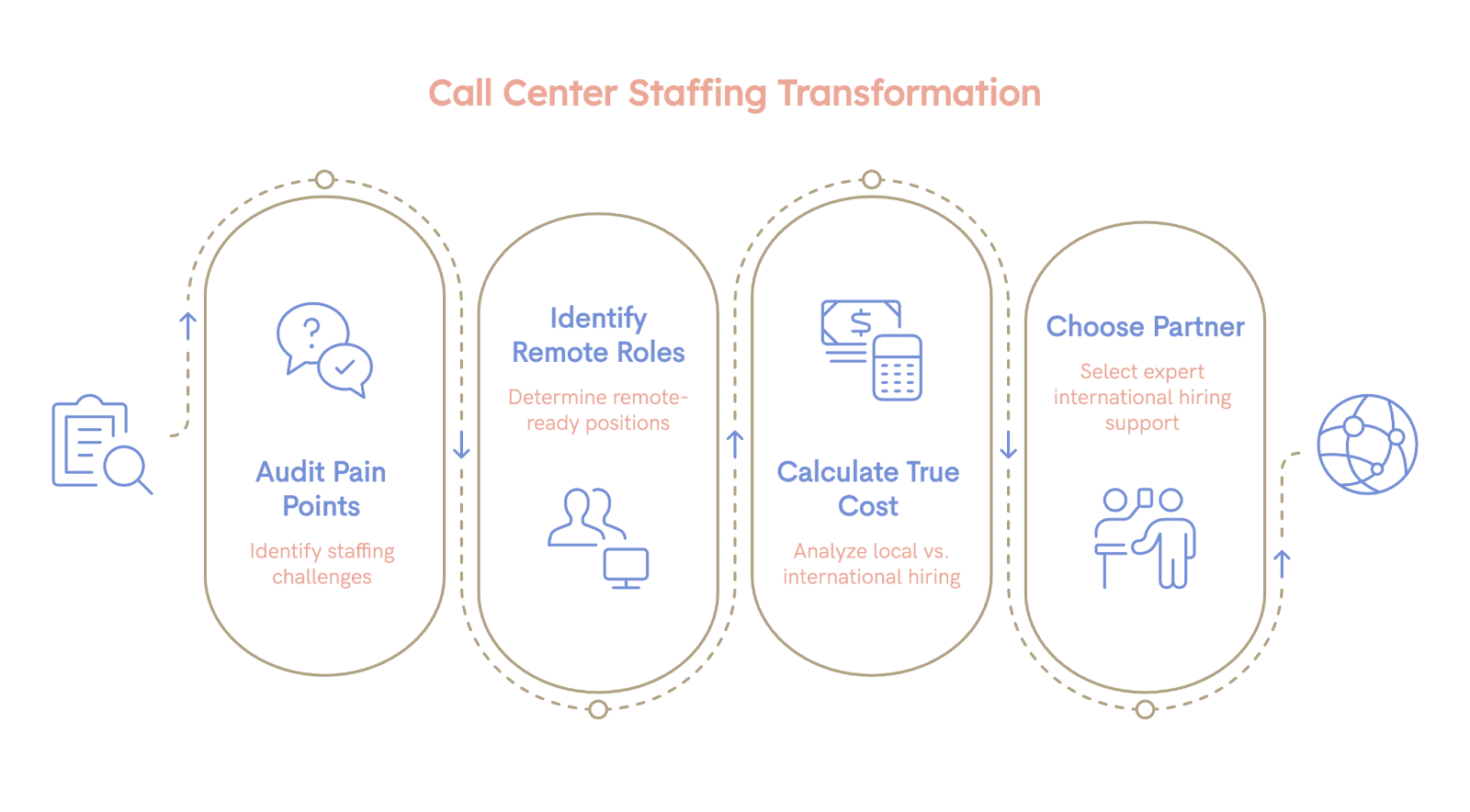 Remote call center staffing means hiring skilled professionals from global talent markets to work remotely as part of your team. With the right talent partner, you'll gain access to professionals with specialized customer service training, diverse experience, and deep expertise. Many international call center professionals are trained specifically for US customer service standards and bring immense value to their positions.