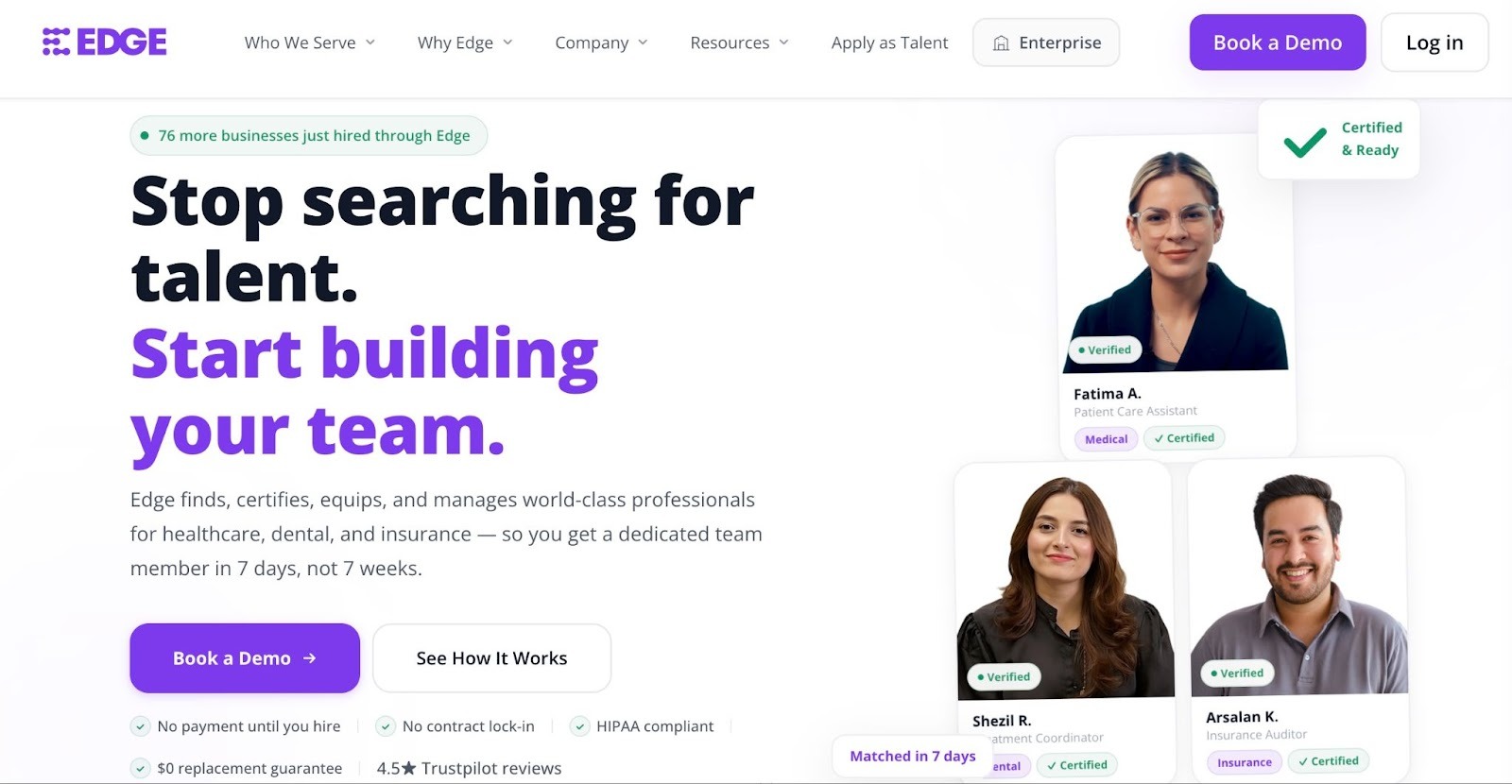 Edge matches every medical specialty with trained talent already proficient in the EHR/EMR systems your team uses. Designed specifically for healthcare, dental, and insurance practices, Edge minimizes onboarding time by connecting you with professionals who understand your tech stack from day one.