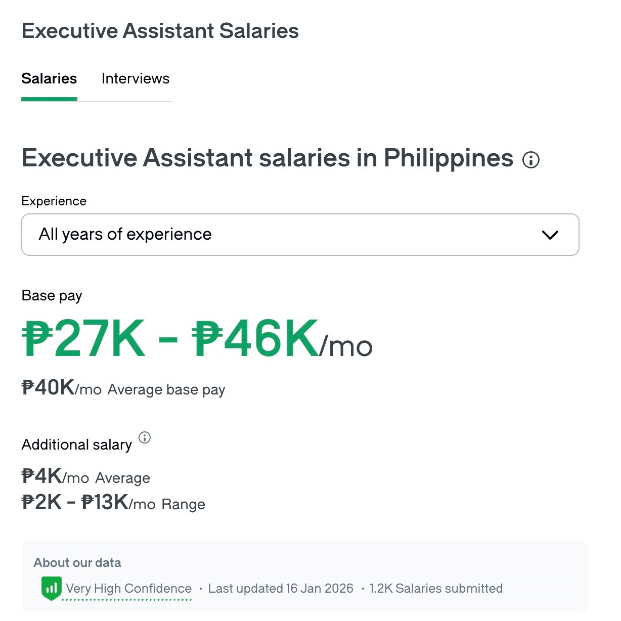 Local Philippine EA salaries range from about $470 to $810 per month, with an average of around $700/month, according to Glassdoor data based on 1,200 salary submissions (last updated January 2026).