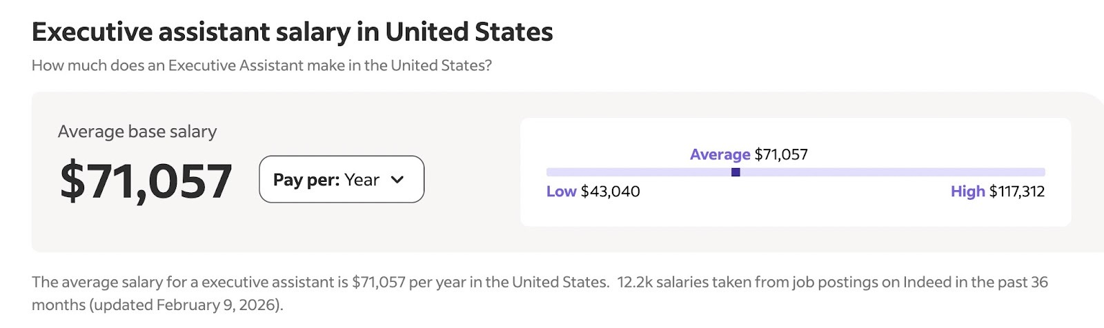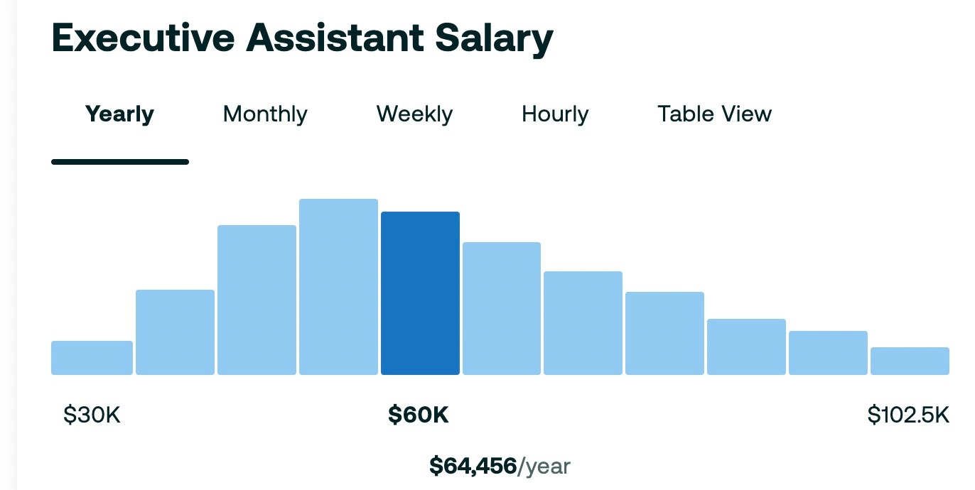 The average base salary for an executive assistant in the US sits somewhere between $60,000 and $75,000, depending on which source you're looking at.