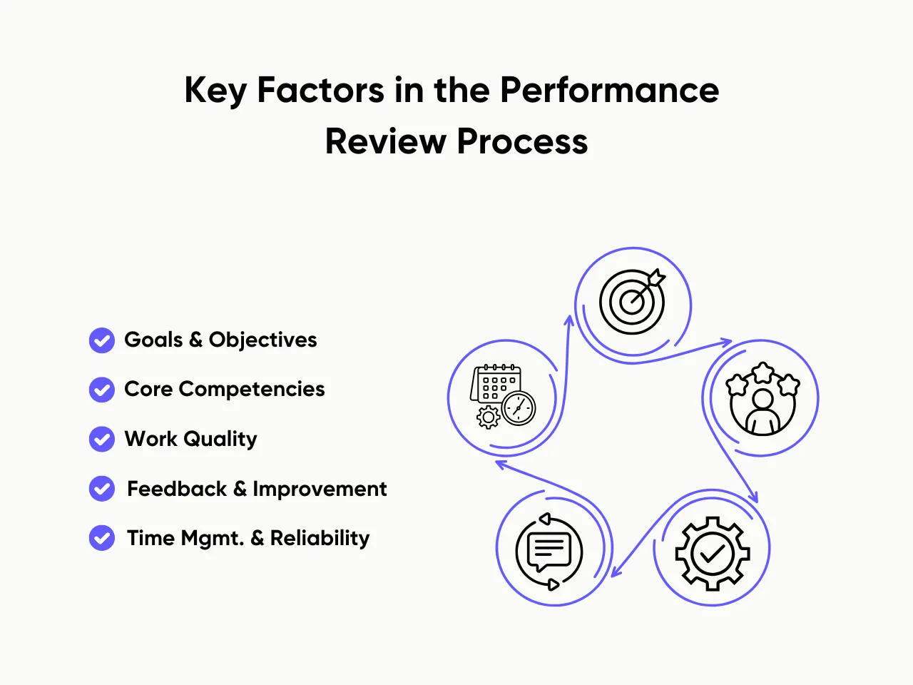Taking time to review shared goals, expectations, and relevant documents ensures you are aligned with what is being assessed. Generally, the performance review process includes several key factors.