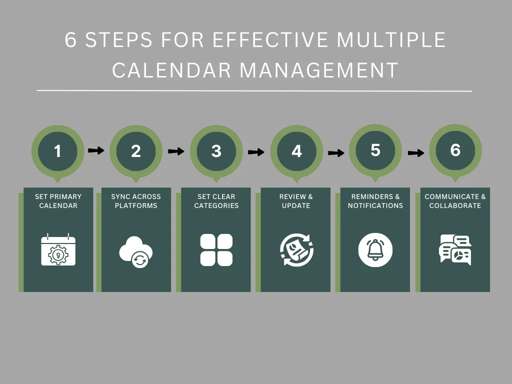 Managing multiple calendars efficiently is essential for staying organized and productive. Effective multiple calendar management ensures no tasks are missed and maximizes your time. Let's delve into the six steps of managing multiple calendars seamlessly to streamline your schedule, minimize conflicts, and boost productivity: