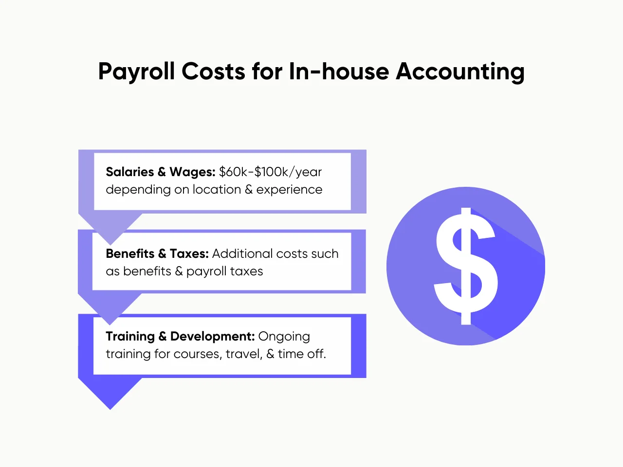 Maintaining an in-house team requires competitive salaries, health insurance, and retirement plans. Additionally, a business entity must invest in continuous professional development to keep the staff up-to-date on regulations and accounting standards.