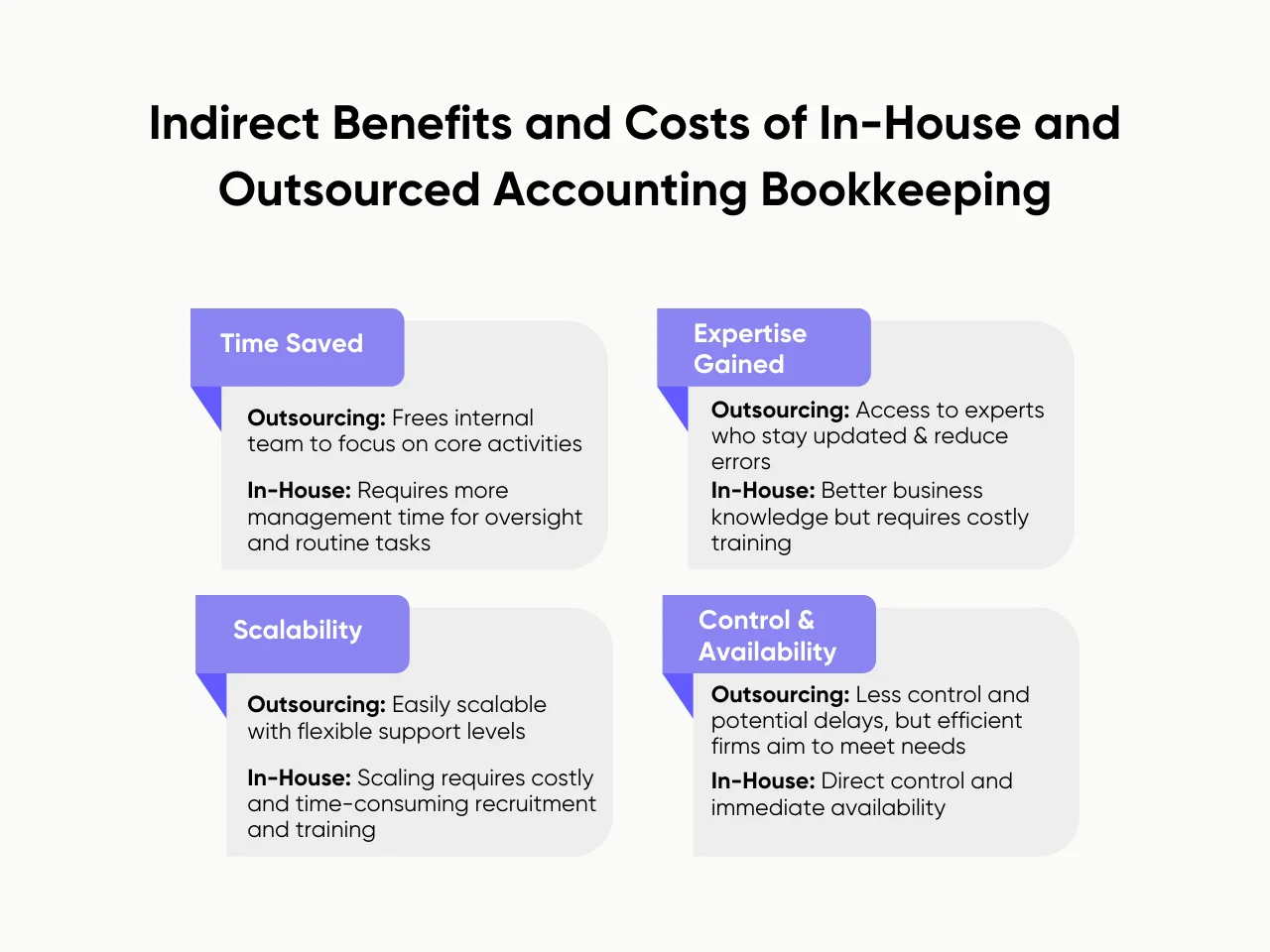Aside from direct costs, it is also essential to consider the indirect benefits and costs when comparing in-house accounting to outsourced accounting bookkeeping. These less tangible factors can significantly impact your business's efficiency and effectiveness. Understanding these aspects will help you make a well-rounded decision.