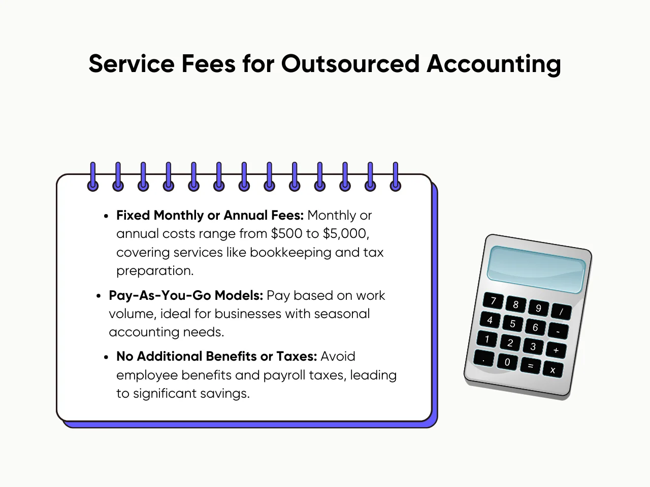 Fixed Monthly or Annual Fees: The cost of outsourced accounting services often depends on a certain level of professional services. This outsourced accounting pricing would cost small to medium-sized businesses around $500 to $5,000 monthly. It will include bookkeeping, payroll processing, tax preparation, and financial reporting.