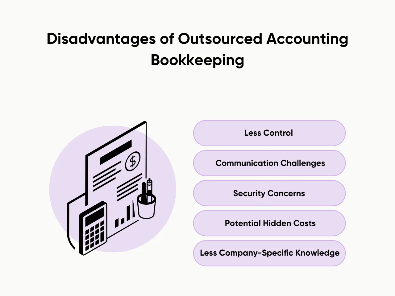 Less Control: Outsourced accounting bookkeeping means you have less direct oversight of your accounting processes. This can lead to delays or tasks needing to be done as you prefer.