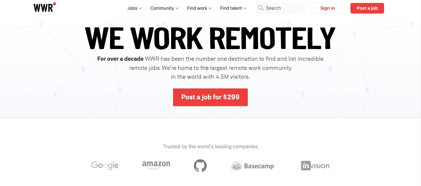 We Work Remotely (WWR) has been a premier recruiter for remote jobs for over a decade. With an extensive global community of 4.5 million visitors, it stands out as a top destination for remote work opportunities.