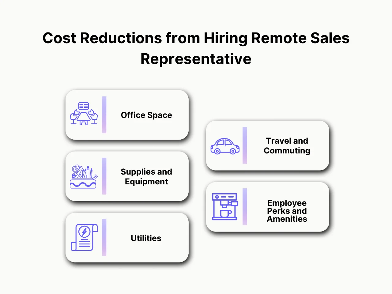 Hiring a remote sales representative can reduce the following overhead costs in several areas: