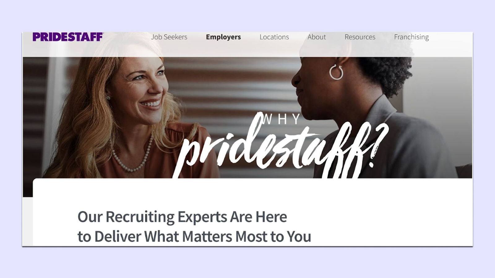 PrideStaff is a traditional staffing agency that runs a hands-on, recruiter-led hiring process through its local offices. Instead of self-serve platforms or AI matching, each role is handled by a recruiter who works directly with the employer to define scope, timelines, and the type of placement needed.