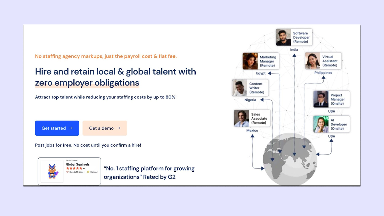 This model works well for companies that want close recruiter involvement and need short-term coverage, quick replacements, or the option to evaluate candidates on the job before committing long-term. It’s less suited for teams looking to hire globally or build distributed remote teams.