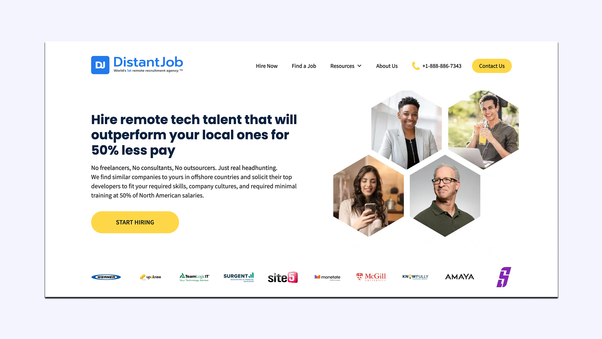 DistantJob is a remote-first recruitment agency focused on full-time software developers rather than freelancers or outsourcing teams. The company operates as a headhunting firm, sourcing engineers from offshore markets and placing them as long-term hires within client companies, typically at lower cost than North American salaries.