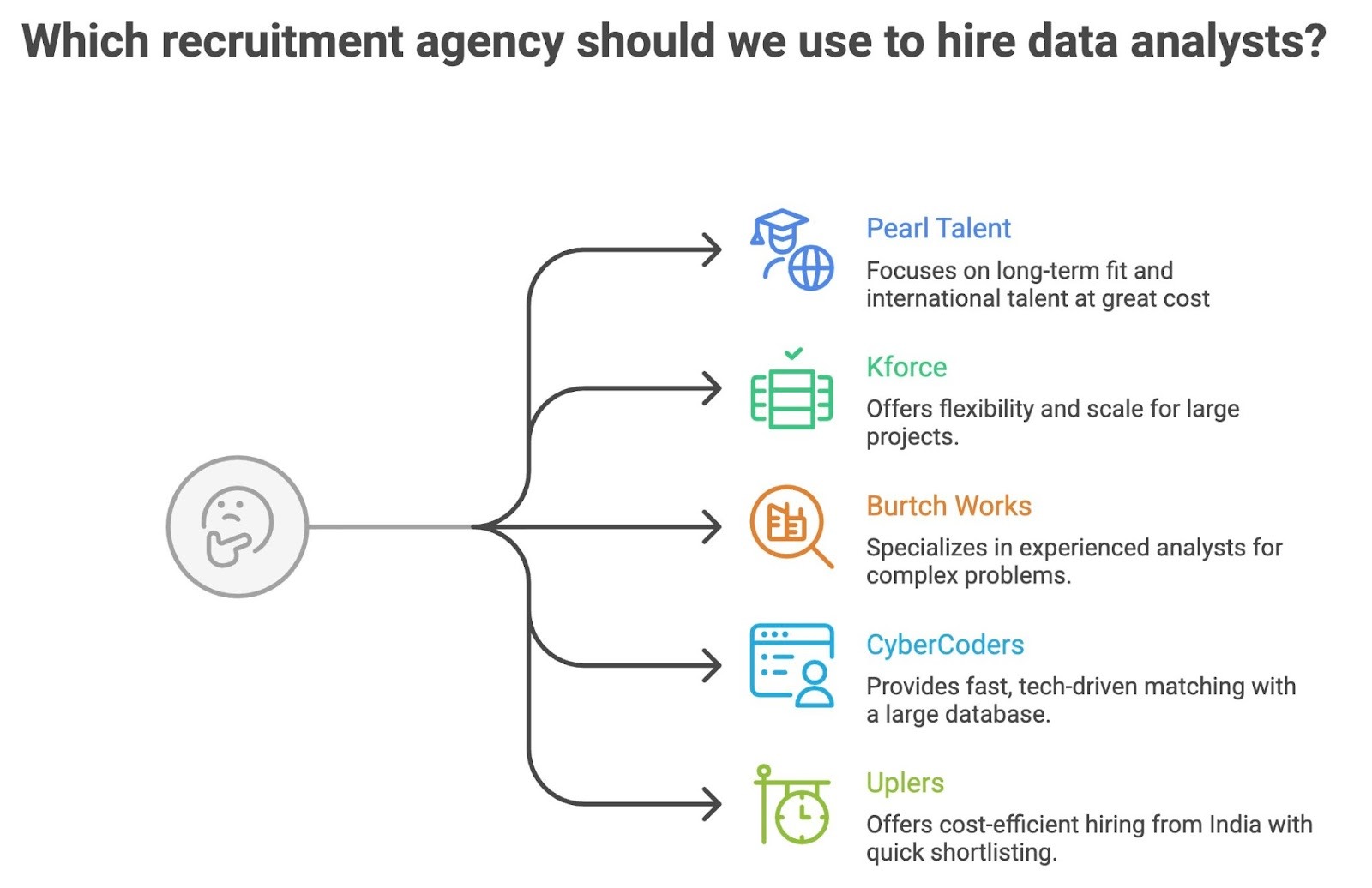 Not all recruitment agencies approach data analyst hiring the same way. Some focus on speed and volume, while others specialize in deeper vetting or global talent access. The agencies below represent different approaches to hiring data analysts.