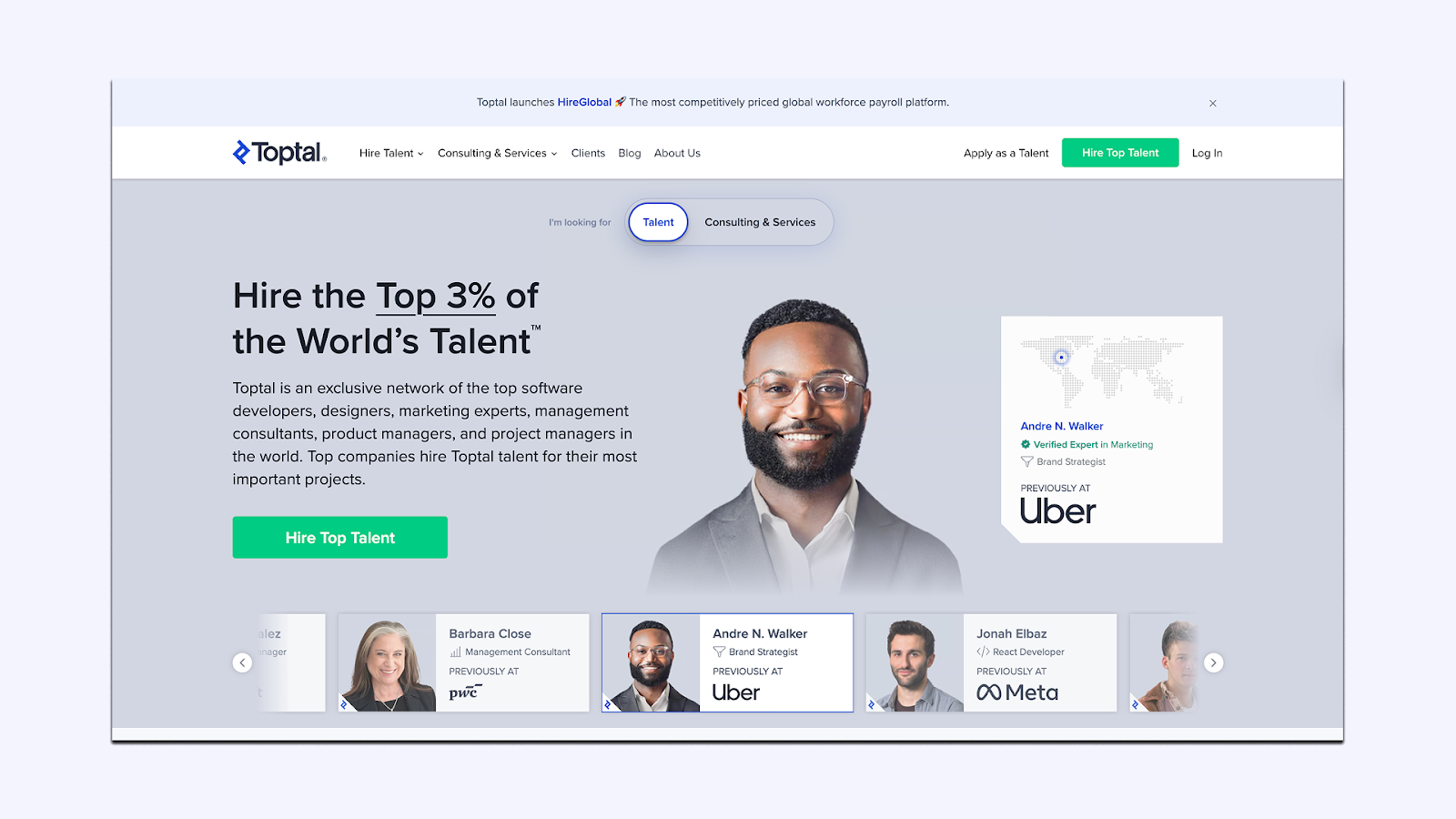 Toptal is all about elite freelancers. Their pitch is “top 3% of talent worldwide,” and they vet hard. If you want fractional or project‑based support from seasoned professionals (say, a growth strategist to shape your funnel or a performance marketer to optimize paid channels), Toptal is a strong option. It’s less about building a team, more about plugging in expertise when you need it.