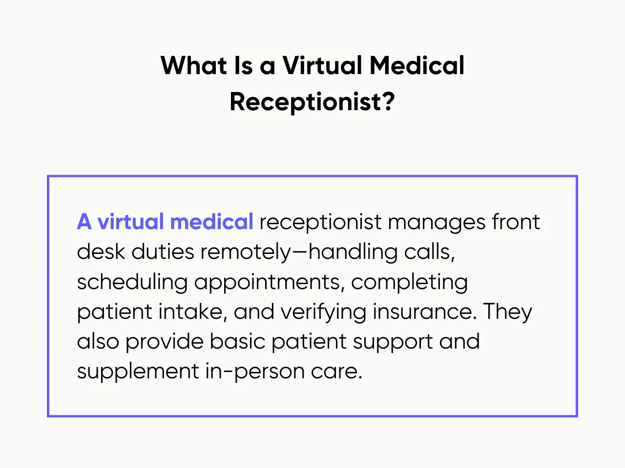 A virtual medical receptionist is trained to manage front desk responsibilities remotely, such as handling calls, scheduling appointments, completing patient intake, and verifying insurance. While working remotely, they can provide basic patient support and supplement in-person patient care.