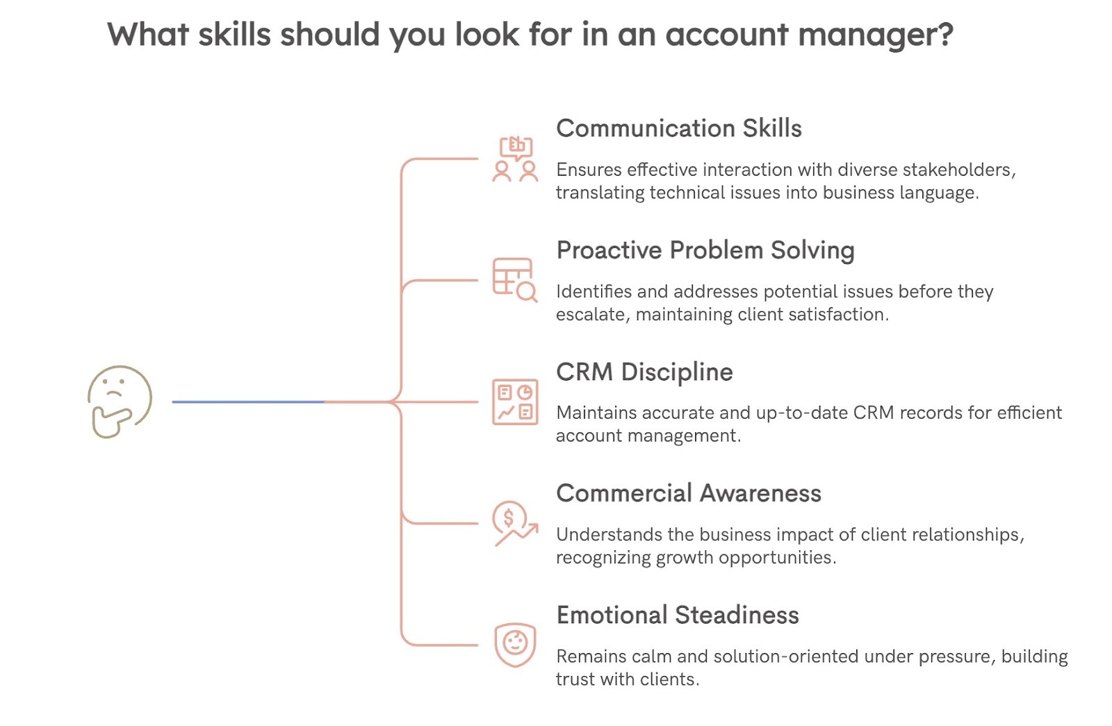 The best account managers stay clear-headed when a client is upset. They acknowledge the problem without getting defensive and then actually move toward a solution instead of getting stuck in apology mode. They treat a difficult client conversation as a chance to build more trust rather than something to survive. That's a temperament thing as much as a skill, and it's worth screening for during the hiring process.